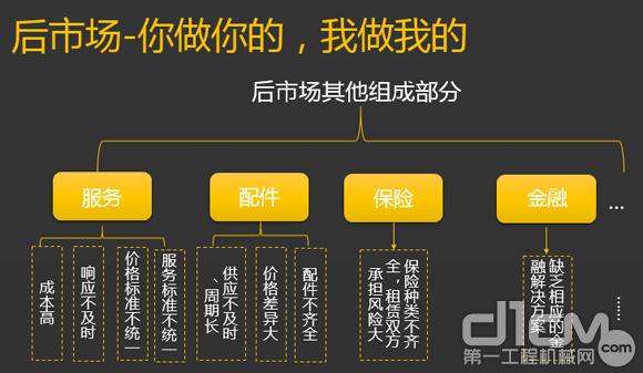 我们今天的会议是营销&后市场大会,服务、配件、保险、金融等都是后市场的组成部分,这每一项的延伸都是一单生意,但也存在成本高、价格标准不全、价格差异大、风险管控不足等诸多问题。以上我们也分析了一些行业的痛点,这其中最大的痛点在于供求双方的信息不对称。所以,我们期望从租赁切入寻找设备,然后打通所有的后市场,因为租赁是设备使用率最高的方式。
