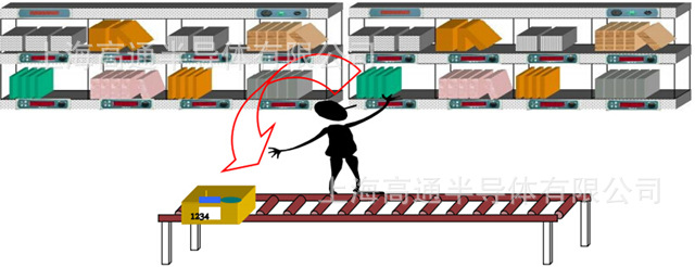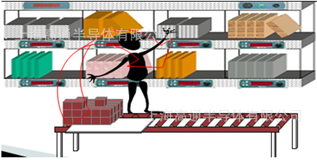 货物安装一个电子标签。根据订单、清单数据,发出出货指示,同时货架上的电子标签亮灯(闪亮),操作