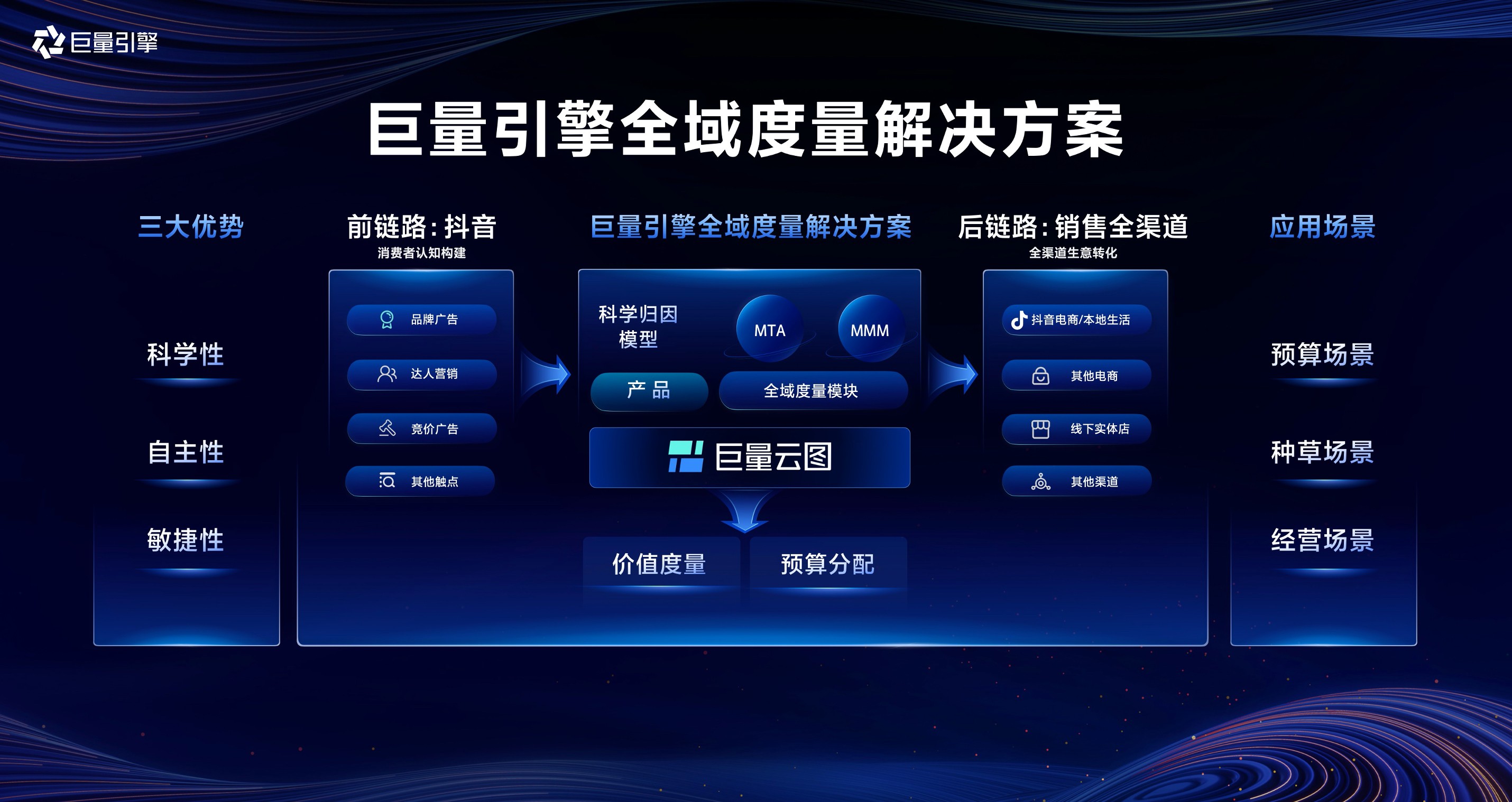 显然,要正确认知抖音的全渠道价值,就需要从全局出发,把“闭环价值”与“外溢价值”结合起来看。为了帮助企业实时看清并用好抖音的全域价值,巨量引擎营销科学团队开发了专门的度量产品,不仅可以及时看清抖音营销对站内及站外渠道生意转化的贡献,同时可以分渠道的拆解生意目标,优化预算分配,帮助企业构建全局的策略思维,算清全盘的账,花好钱,做好决策。