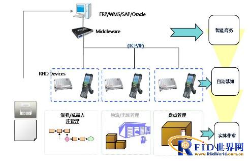 RFID 仓储物流管理系统的目标是在仓库体系中建立一条基于RFID技术的快速通道,实现库房高效管理,收发货高速自动记录。系统以RFID 中间件为支撑平台,由收货、入库、盘点、出库等多个流程组成,各功能既可独立运行也可平滑连接,形成一个完整的基于RFID 自动识别技术的仓储物流管理系统。